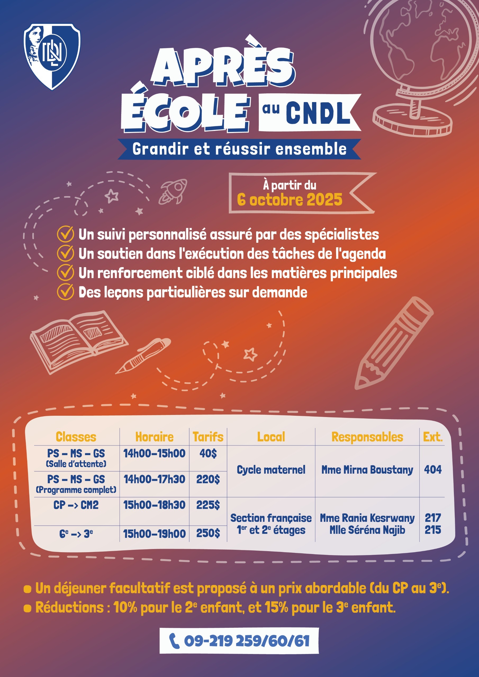 Le Programme de Soutien Académique Après l'École au Collège Notre Dame de Louaizé est conçu pour offrir aux apprenants une assistance d'apprentissage personnalisée, un soutien pour les devoirs et un tutorat spécifique aux matières dans un environnement structuré et encourageant. Notre objectif est d'améliorer la réussite des apprenants, de renforcer leur confiance et de consolider les concepts académiques clés grâce à des conseils d'experts et à des stratégies d'apprentissage ciblées.
