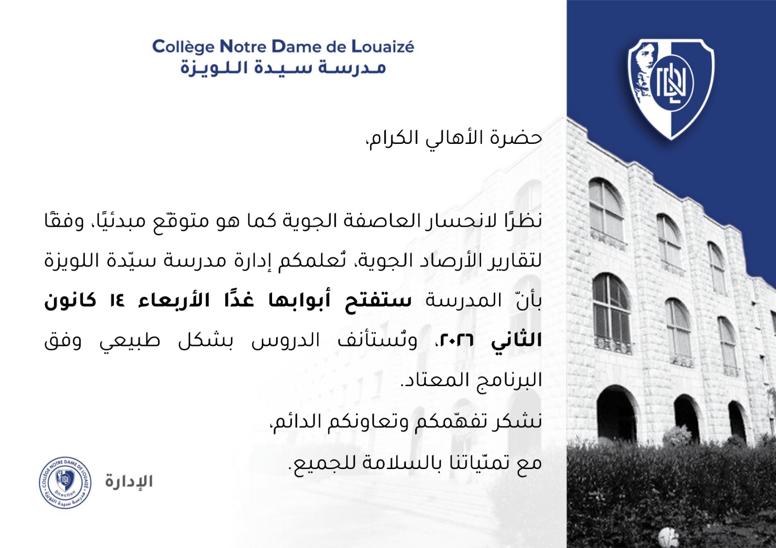 Urgent: College Notre Dame de Louaizé will be open tomorrow. Click here to view more.